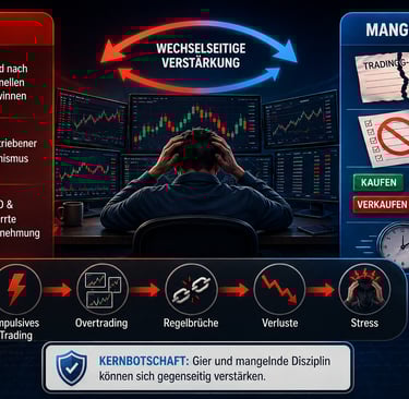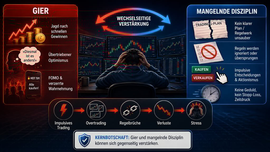 Kernaussage: Gier und mangelnde Disziplin sind beim Trading keine getrennten Schwächen. Sie können sich gegenseitig verstärken: Gier erhöht den Handlungsdruck, mangelnde Disziplin senkt die Hemmschwelle zum Regelbruch.